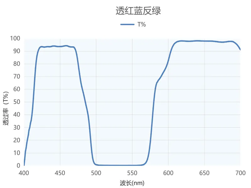 Дихроические зеркала, объективы и дихроические фильтры обеспечивают разное соотношение распределения света для падающего света разных длины волн. Дихроические распределительные зеркала используются для комбинирования или разделения лазерных лучей разных цветов. Основная особенность негативного фильтра данного продукта — способность подавлять ослепительный зелёный лазерный луч, защищая глаза работников, а также обеспечивать чёткое различение объектов по их цветовым спектральным характеристикам.