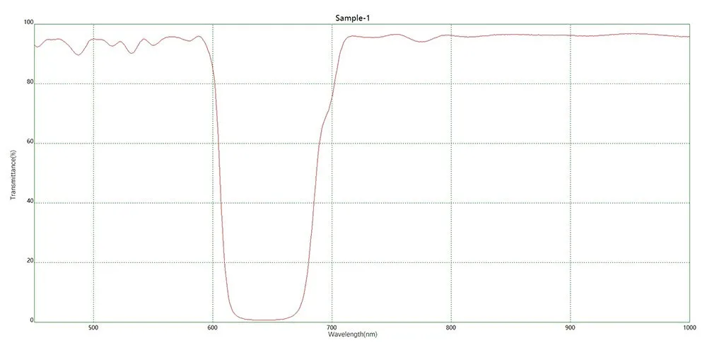 Устранение лазерного помехового излучения: это наиболее распространенный сценарий применения. Фильтр блокирует лазерное излучение с длиной волны 650 нм (например, красный лазерный стилус или определенные лазерные диоды), предотвращая его влияние на детектор, систему визуализации или другие источники света. Например, в флуоресцентных микроскопах, Рамановских спектрометрах и флуоресцентных цитометрах.
