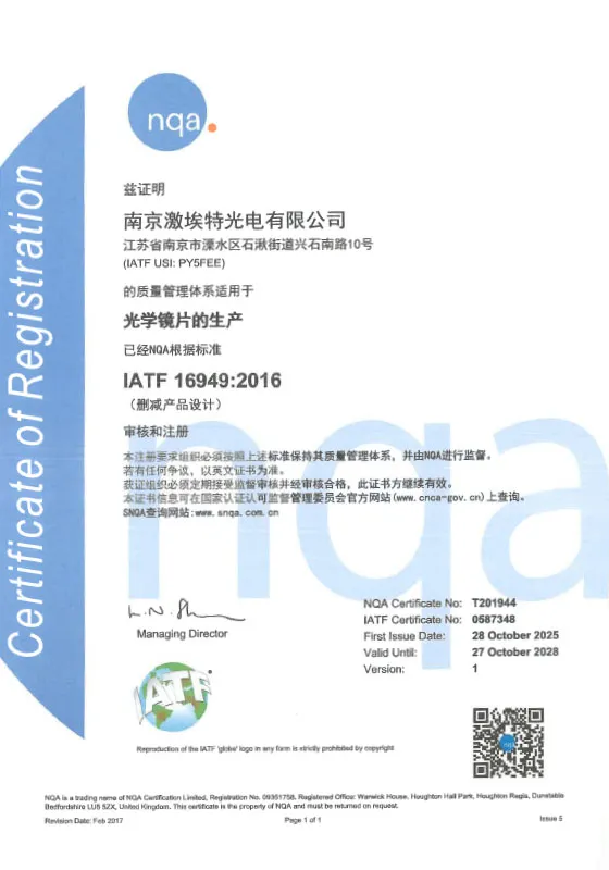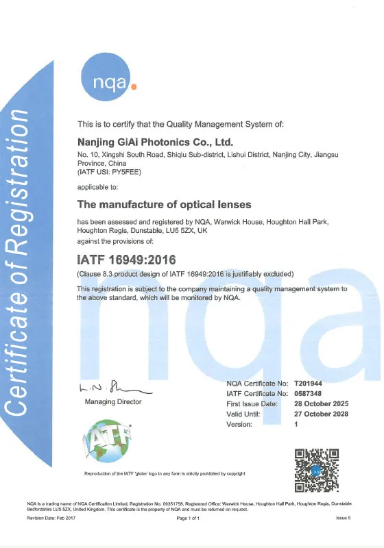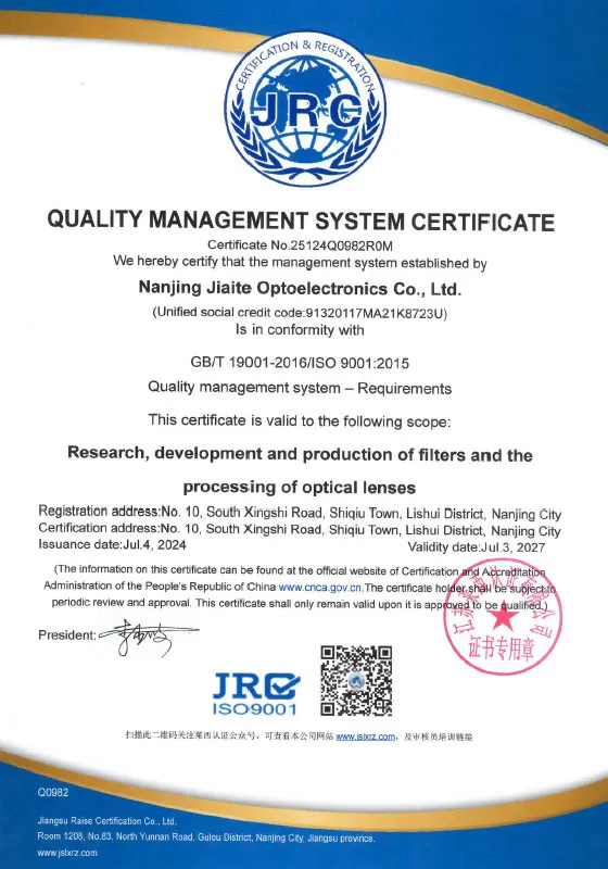Руководствуясь принципом качества «тщательное проектирование, точное исполнение, постоянное совершенствование и искреннее обслуживание», компания Цзиайте Оптоэлектроникс внедрила международную систему менеджмента качества ISO 9001:2015 и стандарт IATF 16949:2016 для управления качеством в автомобильной промышленности. Продукция компании соответствует многочисленным нормативным требованиям, а также прошла тестирование и сертификацию SGS.